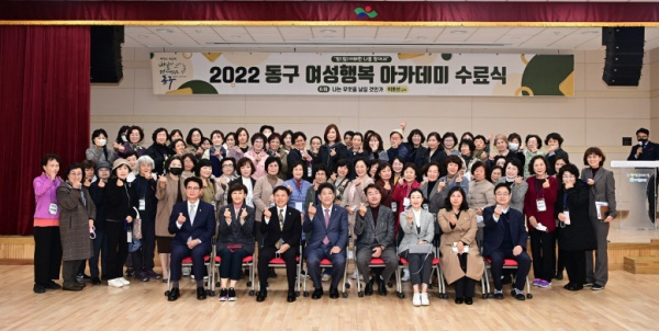 대구 동구청(구청장 윤석준)은 지난 22일, 동구청소년문화의집 아름드리 5층 대강당에서 여성아카데미 교육수료생 등 90여명이 참석한 가운데 2022년 동구여성 행복아카데미 수료식을 진행했다.