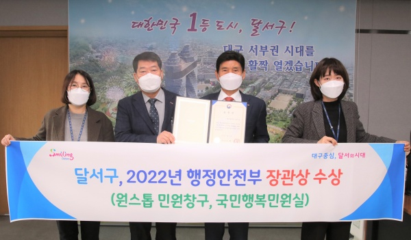대구 달서구(구청장 이태훈) 지난 25일 행정안전부 주관 「제1회 민원의 날」 행사에서 대구에서 유일하게 ‘원스톱 민원창구 우수기관’, ‘국민행복민원실’ 민원행정분야 2개의 표창을 받았다고 밝혔다.