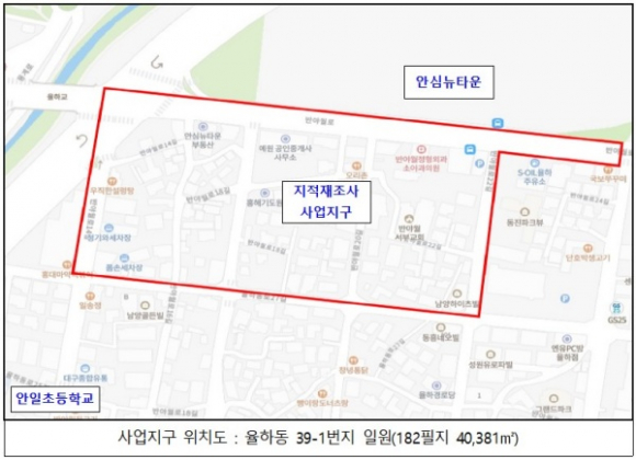 대구 동구청(구청장 윤석준)은 오는 9일 안심1동행정복지센터에서 토지소유자 등을 대상으로 ‘율하1지구’ 지적재조사사업에 대하여 주민설명회를 개최한다.
