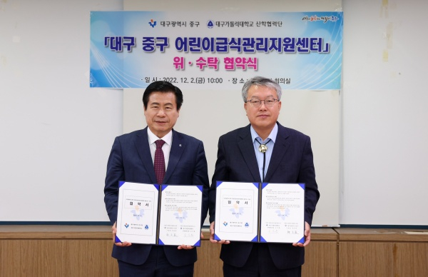 대구 중구(구청장 류규하)는 지난 2일 구청 소회의실에서 대구가톨릭대학교 산학협력단(단장 김기홍)과 중구 어린이급식관리지원센터 위탁운영에 관한 협약을 체결했다.