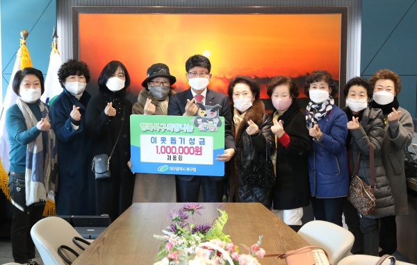 북구 관내 순수 민간 모임인 ‘채움회(회장 김광자)’에서 12월 6일(화) 북구 저소득층을 위한 성금 100만원을 대구 북구청(청장 배광식)에 기탁했다.