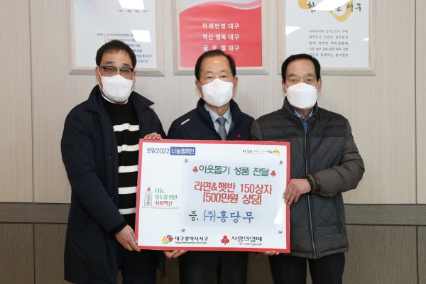 여성장애인기업인 ㈜홍당무(대표 변순영)는 지난 12월 6일(화) 라면 150상자, 햇반 150상자(500만원 상당)를 서구청(구청장 류한국)에 기탁했다.