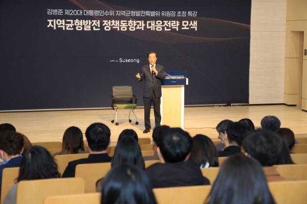 이날 특별강연은 ‘대한민국 어디서나 살기 좋은 지방시대’ 구현을 위한 정부의 지역균형발전 정책 추진 방향을 알아보고, 지역균형발전 선도 지역으로의 도약을 위한 수성구의 추진전략 및 발전방안을 모색하고자 마련됐다.