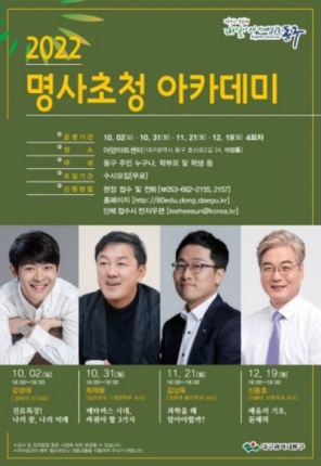 지역 평생학습 활성화를 위해 진행중인 중인 명사초청 아카데미는 주민 누구나 수강할 수 있는 교육 프로그램으로, 다양한 분야에 교육 기회를 제공하는 동구 대표 학습 프로그램이다.