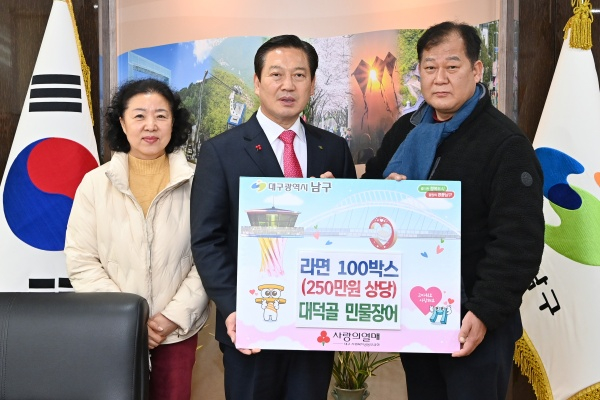 대구광역시 남구청(구청장 조재구)은 지난 16일, 대덕골민물장어(대표 강경호)에서 어려운 이웃의 따뜻한 겨울나기를 위해 라면 100상자(250만원 상당)를 전달했다고 20일 밝혔다.