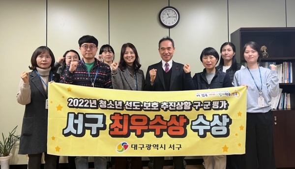 대구 서구청(구청장 류한국)은 대구시 주관 ‘2022년 청소년 선도보호 구․군 평가’에서 8개 구․군 중 최우수 기관으로 선정되었다.