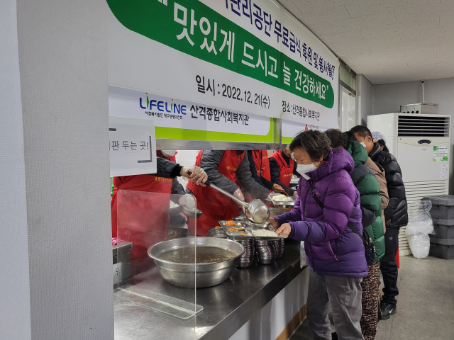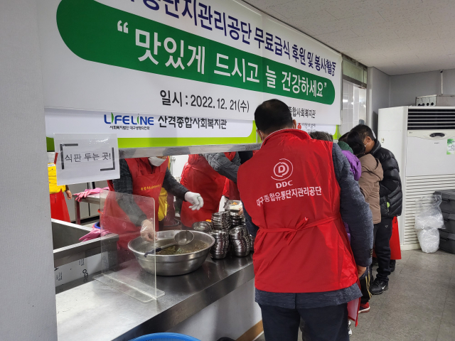 대구종합유통단지관리공단(이사장 김상출)이 21일 북구 산격동 산격종합사회복지관에서 지역 내 소외계층을 위한 무료급식 봉사활동을 실시했다. 이번 봉사활동은 공단 김상출 이사장이 매년 꾸준히 추진해온 활동으로 전기조명관 이사장을 비롯한 임직원 등 10여 명이 동참하여 따뜻한 온정을 나눴다.