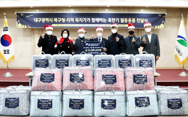 대구 북구청은 독지가의 후원으로 12월 23일(금) 북구청 대회의실에서 지역 내 저소득 독거 어르신들의 따뜻하고 건강한 겨울나기 지원을 위한 ‘혹한기 월동용품 나눔 전달식’을 진행하였다.