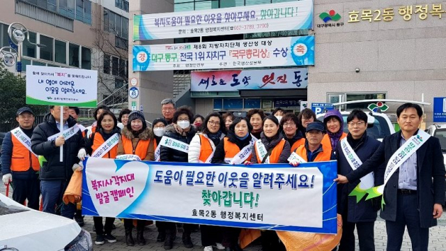 대구 동구 효목2동통장협의회(위원장 주재원)에서는 지난 25일부터 설을 맞이하여 유동인구가 많은 동구시장 주변일대에서 복지사각지대 발굴을 위한 거리홍보 및 캠페인을 실시했다.