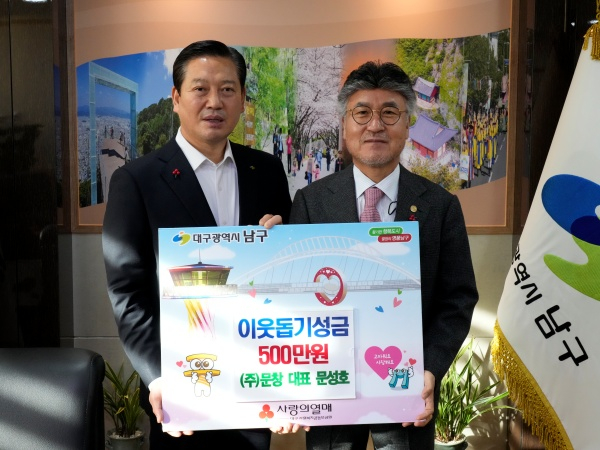 대구광역시 남구청(구청장 조재구)은 지난 26일, (주) 문창(대표이사 문성호)에서 사랑의 성금 5백만원을 남구청에 기탁하였다고 27일 밝혔다.