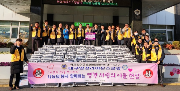 국제라이온스협회 356-A지구 제3지역 영경라이온스클럽에서 26일(월) 서구의 저소득 취약계층을 위하여 겨울이불 100채(800만원상당)를 서구청(구청장 류한국)에 전달했다.