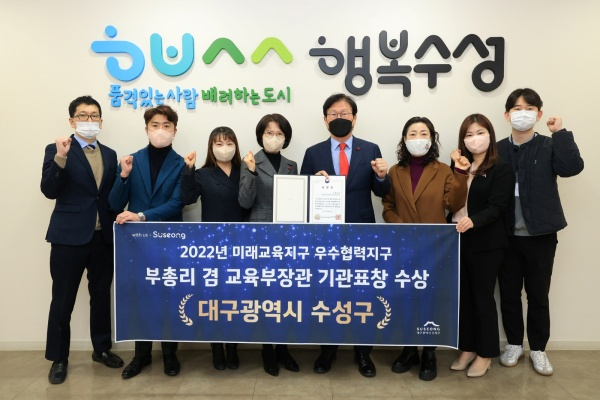 대구 수성구(구청장 김대권)는 2022년 교육부 미래교육지구 우수협력지구 유공 기관으로 선정돼 대구광역시 동부교육지원청(교육장 정병우)과 함께 부총리 겸 교육부 장관 기관 표창을 수상했다고 29일 밝혔다.