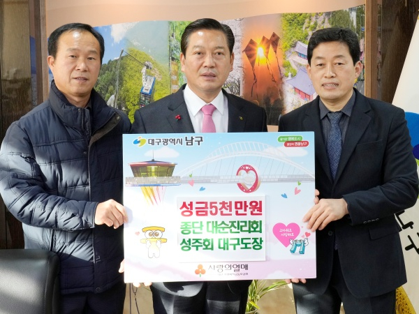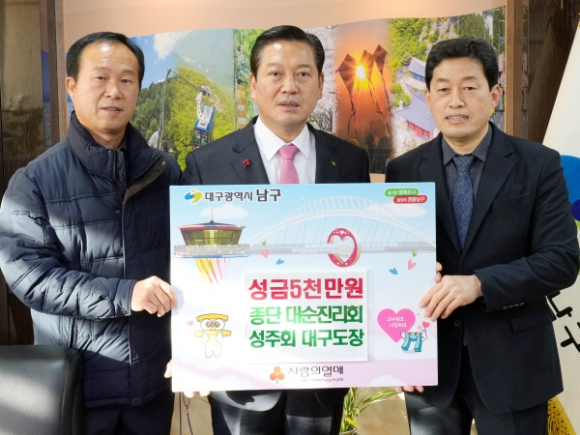 대구광역시 남구청(구청장 조재구)은 지난 23일, 대순진리회 성주회 대구도장(원장 : 정삼암)에서 취약계층의 따뜻한 겨울나기를 위해 이웃돕기 성금 5,000만원을 남구청에 전달했다고 30일 밝혔다