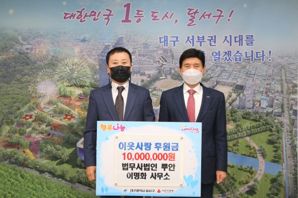 대구 달서구(구청장 이태훈)는 지난 29일 법무사법인 루안 (대표 이명화)로부터 이웃사랑 후원금 1,000만원을 기탁 받았다고 밝혔다.