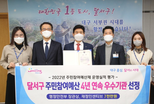 대구 달서구(구청장 이태훈)는 행정안전부 주관 「2022년 주민참여예산제 운영 평가」에서 4년 연속 우수 자치단체로 선정돼 행정안전부 장관 표창과 함께 재정인센티브 7천만원을 확보했다고 밝혔다.