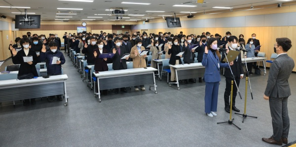 | ↑↑ 지난 2일 수성구청 대강당에서 열린 시무식에서 주요 간부 공무원들이 ‘청렴실천 다짐 결의’를 하고 있다. |