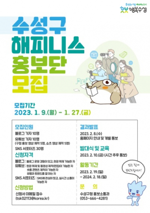 대구 수성구(구청장 김대권)는 구정에 대한 시민 공감 확대를 위해 9일부터 27일까지 ‘2023년 해피니스 홍보단’을 모집한다.
