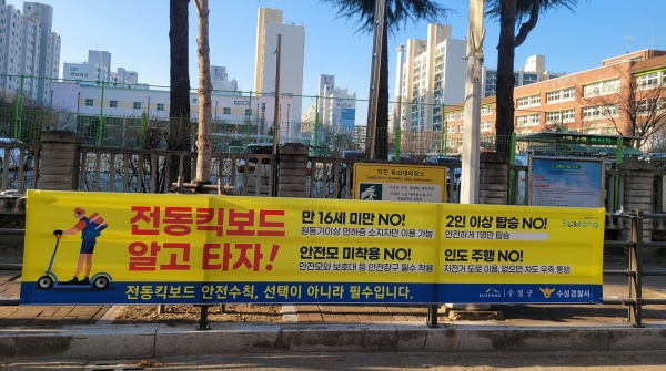 대구 수성구(구청장 김대권)는 전동 킥보드 등 개인형 이동장치(PM) 사고 예방을 위해 개인형 이동장치(PM) 안전 수칙 홍보 현수막을 작년에 이어 올해 중학교에도 게시했다.