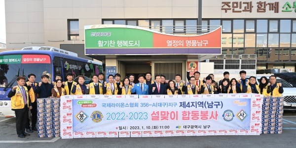 대구광역시 남구청(구청장 조재구)은 지난 10일, 국제라이온스협회 356-A[대구]지구 제4지역(남구)에서 설 명절을 맞아 남구의 저소득 가정 지원을 위해 라면, 식용유, 계란 등(2,950만원 상당)을 전달했다고 12일 밝혔다.