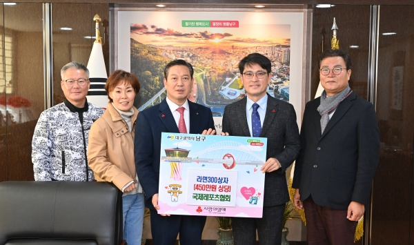 대구광역시 남구청(구청장 조재구)은 국제레포츠협회(회장:임용규)에서 추운 겨울철 어려운 이웃을 위한 라면 300박스(450만원 상당)을 기탁했다고 26일 밝혔다.