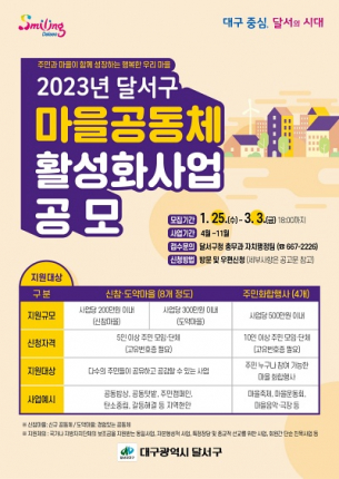 대구 달서구(구청장 이태훈)는 3월 3일까지 이웃 간 배려하고 소통하는 공동체 문화 확산을 위해 ‘2023년 마을공동체 활성화사업’ 참가단체를 공모한다.