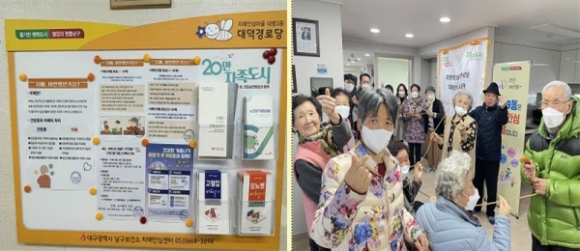 | ↑↑ 대구 남구 치매안심마을(대명3·9) 내 경로당 두 곳에서(대덕·남덕 경로당)에서 치매정보게시판 제막식이 열렸다. |