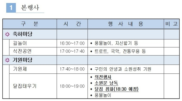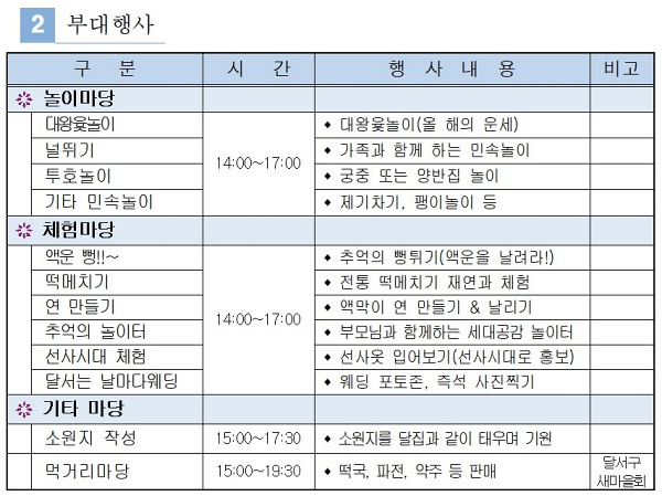 코로나19로 인해 4년만에 개최되는 이번 축제는 기원제, 달집태우기 등 본행사와 대왕윷놀이, 투호놀이, 널뛰기, 연날리기를 체험할 수 있는 민속놀이 마당, 떡메치기 체험 부대행사와 축하공연 등 그 어느 때 보다 다채로운 프로그램들이 준비돼 있다.