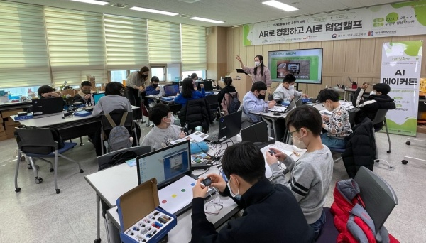 | ↑↑ ‘디지털 새싹 캠프’ 운영, AI 메이커톤 프로그램을 활용해 학생들이 허스키렌즈로 사물을 인식하는 모습(집합형) |