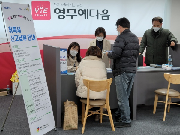 이번 ‘이동 세무 사무소’는 서대구KTX영무예다음 사전점검일인 2월 3일부터 5일까지 사흘 동안 아파트 내 상담부스를 설치하여 운영하였으며 취득세 업무 담당자 및 납세자보호관 등으로 편성된 상담반이 130여 명의 입주 예정자에게 다주택자 취득세 중과, 생애최초 감면 등 입주 시 필요한 취득세 등에 대하여 세무 상담 서비스를 제공하였다.