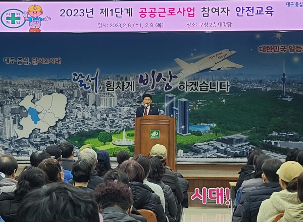 대구 달서구(구청장 이태훈)는 8일, 9일 양일간 구청 2층 대강당에서 2023년 1단계 대구형 희망플러스 일자리사업(공공근로사업) 참여자 300명을 대상으로 안전보건교육을 실시했다고 밝혔다.