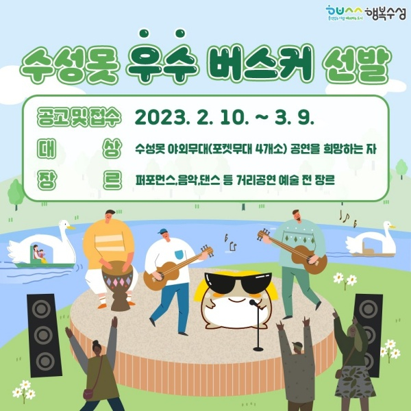 대구 수성구(구청장 김대권)는 코로나19 이후 4년 만에 수성못 야외무대를 빛낼 우수버스커를 선발한다.