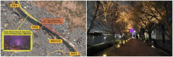 | ↑↑ 금호강변 벚나무길 경관조명 연계설치사업 전기공사 위치도(좌) 및 설치 사진(우) |