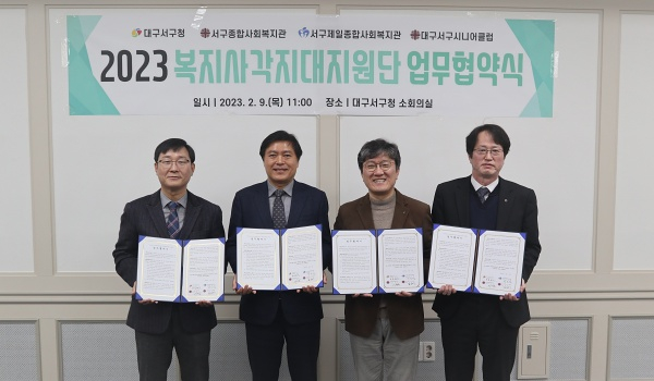 대구 서구청은 2월 9일(목) 서구시니어클럽, 서구종합사회복지관, 서구제일종합사회복지관과 함께 지역의 복지사각지대 해소 및 지역복지 향상을 위한 『복지사각지대 지원단』 사업 업무 협약을 체결했다.