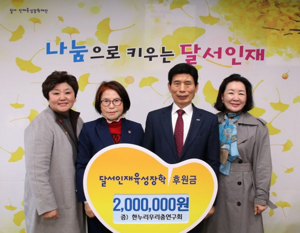 달서구 상인동에 위치한 한누리우리춤연구회는 한국의 전통춤을 연구하는 단체로 공연 수익금 200만원을 전달했다. 한누리우리춤연구회는 지역인재육성을 위해 2020년부터 지금까지 총 672만원을 후원해왔다.