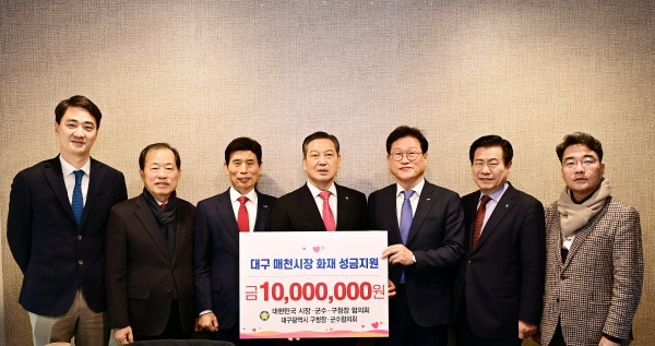 대한민국시장군수구청장협의회(대표회장 조재구)와 대구광역시 구청장 군수협의회(협의회장 조재구)는 매천시장 화재 피해 복구지원을 위해 성금 1,000만원(각 500만원)을 쾌척했다고 밝혔다.