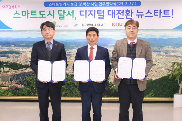대구 달서구(구청장 이태훈)는 27일 구청 5층 상황실에서 LH 대경본부(본부장 신광호), 경북대 스타트업지원센터(센터장 김현덕)와 2023년 스마트빌리지 보급 및 확산 사업 추진을 위한 업무협약을 체결했다고 밝혔다.