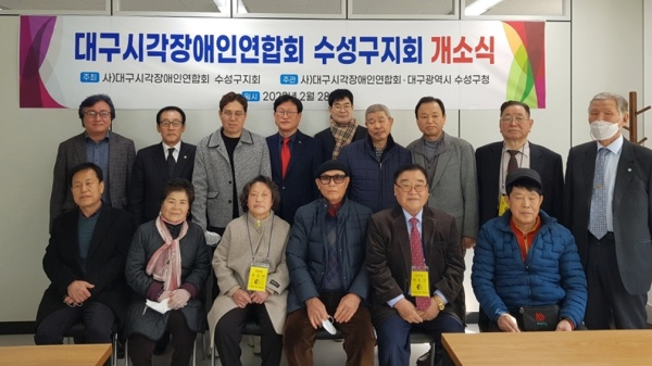 | ↑↑ 대구 수성구(구청장 김대권)는 지난 28일 시각장애인 ‘전용 쉼터’ 사무실을 두산동으로 이전하고 개소식 개최 후 기념 촬영하고 있다. |
