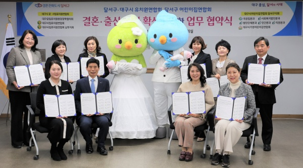 대구 달서구(구청장 이태훈)는 지난 13일 구청 회의실에서 대구공립유치원현장장학협의회, 대구사립유치원연합회, 대구어린이집연합회 달서구지회(6개분과)와 초저출산 위기에 공동으로 대응하고자 결혼·출산 문화 확산을 위한 업무 협약을 체결했다고 밝혔다.