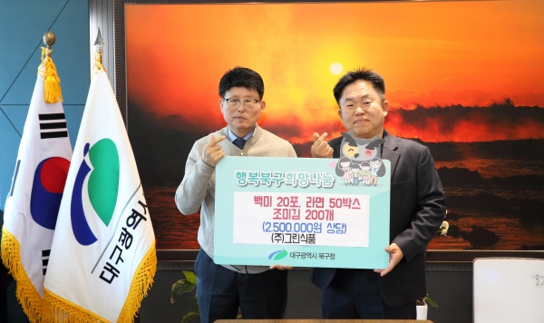 ㈜그린식품(대표 윤상두)은 3월 14일(화) 대구 북구청(청장 배광식)을 방문하여 관내 저소득층을 위해 250만원 상당의 백미 200kg, 라면 50박스, 조미김 20박스를 기탁했다.