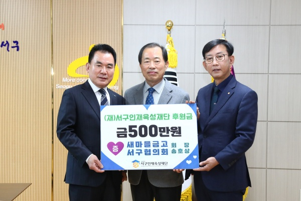 서구 관내 새마을금고는 사랑의 좀도리 운동 외 장학사업, 먹거리 나눔사업, 문화체육 행사 등 금고별 다양한 지역사회 공헌사업을 꾸준히 추진하고 있으며, 새마을금고 서구협의회는 전년도 420만원 상당 이웃돕기 성금과 물품 기부에 이어 올해 (재)서구인재육성재단에 후원금 5백만원을 기탁하였다.
