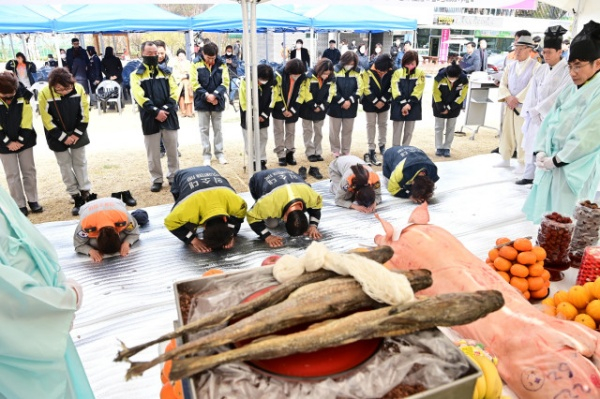 | ↑↑ 대구 동구청(구청장 윤석준)은 동부소방서 불로지역 의용소방대 대원들과 함께 지난 17일 도동 측백나무 숲 주차장에서 천연기념물 도동 측백나무 숲 보존 및 재난안전 기원제를 열었다. |