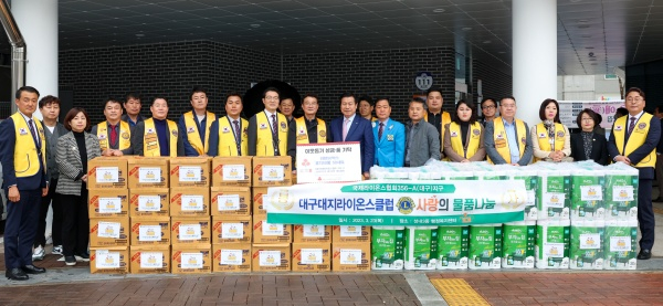 국제라이온스협회 356-A(대구)지구 제1지역(부총재 이몽규) 대지클럽(회장 손명곤)은 지난 23일 대구 중구 성내3동 행정복지센터를 방문하여 라면 50박스, 휴지 50세트(200만원 상당)를 기탁했다.