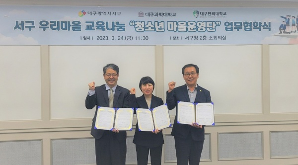대구광역시 서구(구청장 류한국)는 3월 24일 우리마을 교육나눔사업 『청소년 마을운영단』 운영을 위한 대구과학대학교(총장 박지은) 청소년교육지도과 및 대구한의대학교(총장 변창훈) 청소년교육상담학과와 업무협약을 체결했다.