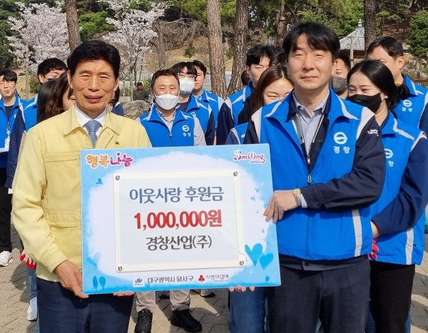 대구 달서구(구청장 이태훈)는 지난 30일 경창산업㈜(대표 손일호, 강기봉)로부터 이웃사랑 후원금 100만원을 기탁 받았다고 밝혔다.