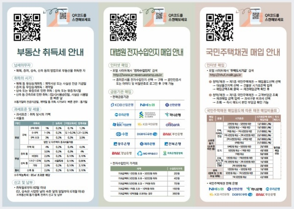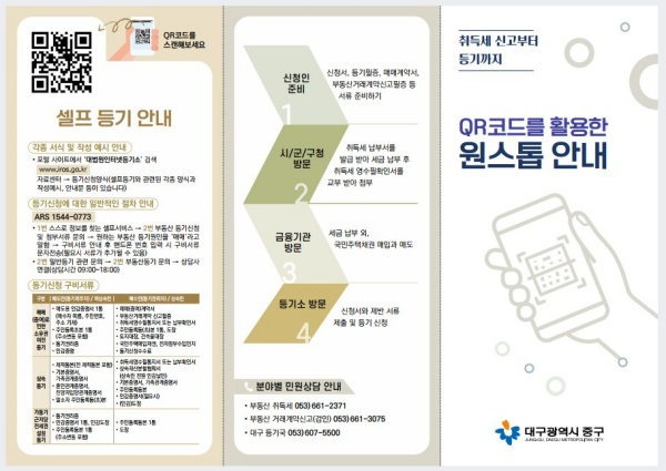 대구 중구(구청장 류규하)는 셀프등기 안내 QR코드를 제작·활용해 취득세 신고 및 부동산 등기 절차 등에 대한 원스톱 정보를 제공한다.