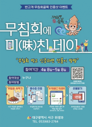 대구 서구청(류한국 서구청장)에서는 오는 5. 8(월)까지 대구 10味 중 하나이며 서구 우수 먹거리인 무침회를 홍보하여 소비를 촉진하고 먹거리 골목 상권 활성화를 위해 ‘무침회에 미(味)친 데이’ 인증샷 이벤트를 추진한다.