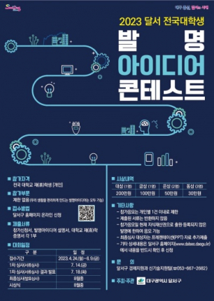 대구 달서구(구청장 이태훈)는 4월 24일부터 6월 9일까지 전국 대학생을 대상으로 「2023 달서 전국대학생 발명아이디어 콘테스트」참가자를 모집한다.