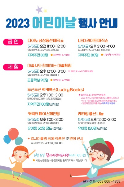 | ↑↑ 2023 어린이날 달서어린이도서관 행사 안내 |