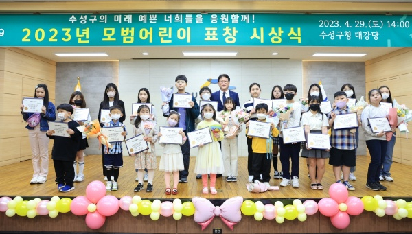 대구 수성구(구청장 김대권)는 어린이날을 맞이해 지난 29일 구청 대강당에서 ‘2023년도 모범 어린이 표창’ 시상식을 개최했다.