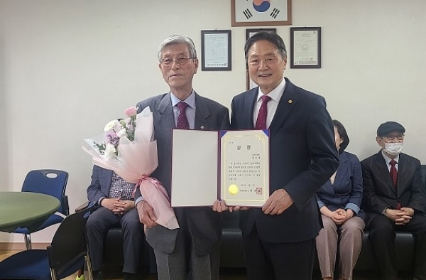| ↑↑ 대구 수성구 범어1동제1경로당이 2023년 대구광역시 ‘모범경로당’으로 선정돼 정두진 회장이 상장과 꽃다발을 받고 기념 촬영하고 있다. |